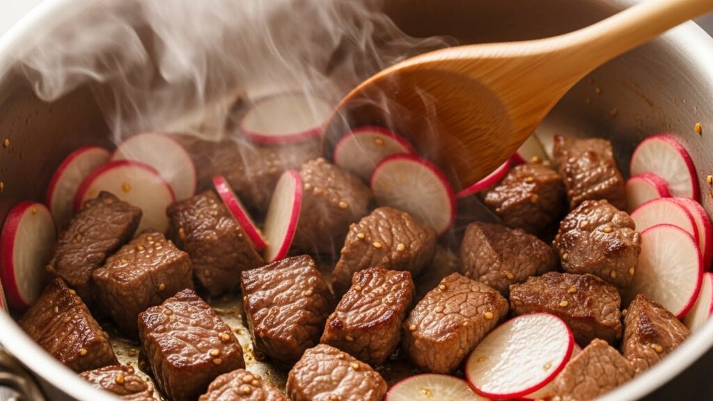 - ✔️ 참기름에 고기와 무를 충분히 볶기