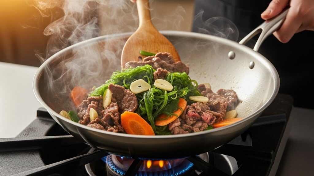 미역 색이 선명한 초록색으로 변하고, 고소한 냄새가 온 주방을 진동할 때까지 충분히 볶아줍니다. (약 3~4분)
