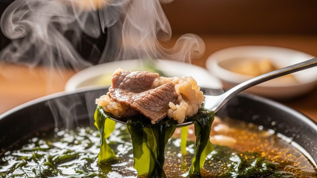 [이미지 마지막: 따뜻한 조명 아래 정갈하게 차려진 미역국 한 상 차림, 수저가 놓여있음]