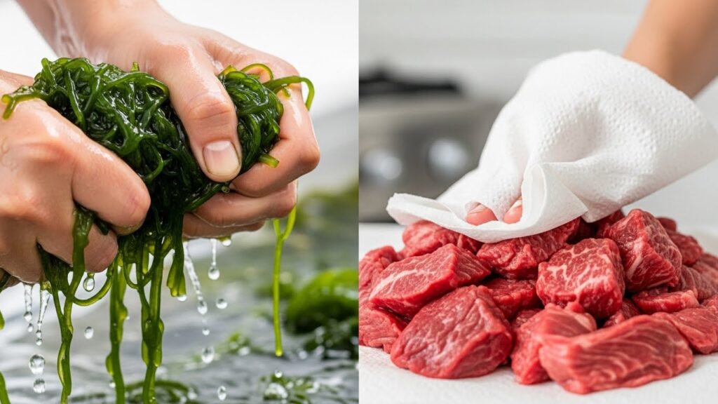 고기는 키친타월로 꾹꾹 눌러서 핏물을 닦아주세요.